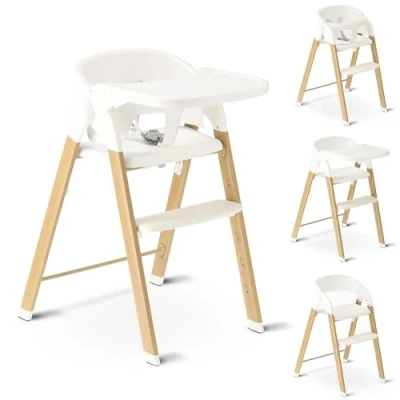 DERYAN Baby & Toddler High Chair Foldable Wooden Includes 5 Point Strap Height Adjustable Safety Belt Tray White/Wood