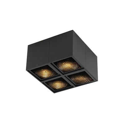 General description The QAZQA Design Spotlight Black 4-Light - Qubo Honey is a sleek and modern spotlight that fits seamlessly into any living space. Made entirely of aluminum and finished in black, this spotlight features a black grid that softens the light output. With four light points, it is perfect for creating ambiance in various settings, from kitchens to bedrooms. Technical specifications Material: Aluminum Color: Black Dimensions: Length 16.5 cm, Width 16.5 cm, Height 9.5 cm Bulb holder: GU10 Max wattage: 4 x 50 W Voltage: 220V/230V Protection class: IP20 Dimmable: Yes (dimmer not included) Lightsource: Exclusive Compatibility and accessories Compatible with Halogen and LED bulbs Usage Suitable for indoor lighting in various spaces including dining rooms, offices, kitchens, bedrooms, stores, and living rooms. Other information