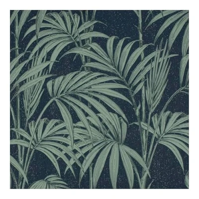WallpaperDirectAn all over palm leaf design with a metallic effect and a lightly glittered background. Shown in the navy colourway. Coordinating plain available.