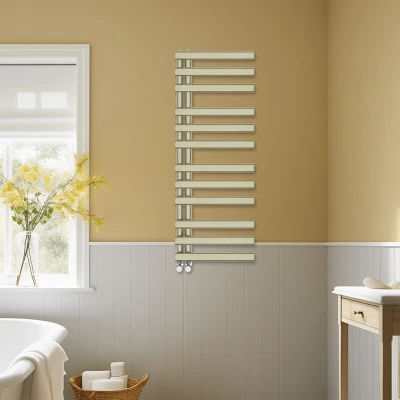 General description These up-market designer heated towel rails provide high heat output to warm your towels as well as your bathroom. Made from hard-wearing steel with a durable high finish, they come with a 10-year guarantee, ensuring your bathroom remains warm and stylish. Technical specifications Dimensions: 1200 x 450 mm Pressure tested to 10 bar Maximum working pressure: 7 bar Manufactured in accordance with BS EN 442 Installation Connects to your central heating system like a normal radiator Can be converted to dual fuel for warm towels all year round (element not included) Fixing pack included complete with plugs and vents We suggest you ask a qualified plumber to install these items Usage Provides high heat output to warm towels and the bathroom Other information 10-year "fit and forget" guarantee (applicable exclusively for water leakage claims within the warranty period) Excludes radiator valves