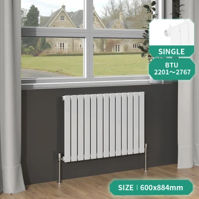 General description Our Designer Radiator offers a contemporary heating solution at a competitive price. It easily integrates into your central heating system like a standard household radiator, ensuring a hassle-free installation. The radiator features a sleek flat panel design in gloss white, making it suitable for any interior decor. Technical specifications Material: 1.5mm premium mild steel Model: Single Flat Panel in Gloss White Size: 600x884mm (HxW) Bars: 13 Water inlet/outlet size: 1/2" Other information Tested under high hydraulic pressure to ensure impermeability Comes with a 15-year guarantee Triple layered finish exceeds 200 hours of neutral acid salt spray testing Tested to BS & EN442 Complies with ISO9001:2008 regulations Compatible with all UK heating systems (tank fed or combi systems)