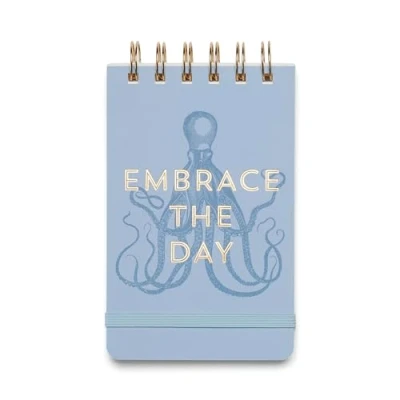 TWIN WIRE BOUND NOTEPAD: Purse-sized with 80 deluxe quality acid-free pages that feature a subject header and to-do list design; a handy elastic closure keeps everything in place CONVENIENTLY SIZED: This handy little notepad measures 8,9 x 14,6 cm, a perfectly-sized companion to take with you everywhere EMBRACE THE DAY: vintage art-inspired octopus and gold text PRINTED USING SOY BASED INK: An earth-friendly alternative way of printing that produces deep, rich bright colors and is easier to recycle DesignWorks INK: Is a Nashville-based design studio with innovative products for writers of notes, letters, and stories as well as people who love great design, attention to detail, and exceptional quality