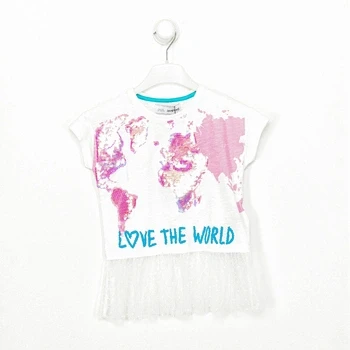 T-shirt. White color Round neck. Short sleeve. Contrast print detail with sequins on the front. Bottom part like tulle tulle. Matching visible seams. Composition: -86% Cotton - 14% Polyamide. Washing instructions: - Wash maximum at 30ºC. - Iron at medium temperature, max. 110 ° C. - Allows you to use a dryer. - Do not use bleach. - It does not support dry cleaning. Composition: 86% Cotton, 14% Polyimide Care: Washing instructions: - Wash maximum at 30ºC. - Iron at medium temperature, max. 110ºC. - Allows you to use a dryer. - Do not use bleach. - Does not support dry cleaning.