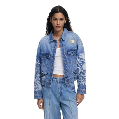 Desigual Lander Blue Denim Trucker Jacket with Oriental Embroidery 25WWED07
