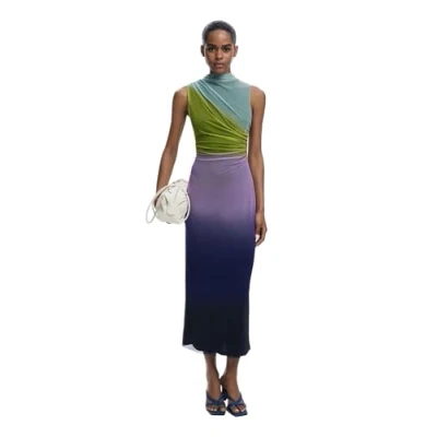 Midi dress in tulle, sleeveless, round neck and front draping with color gradient. Color gradient Fit: Regular Sleeveless Length: Midi Recycled polyester Model’s measurements: Height: 178 cm; Waist: 59 cm; Hip: 86 cm Model size: S SKU: 25WWVK183086 Product Sustainability Recycled Content 93% POLYESTER, 7% ELASTANE