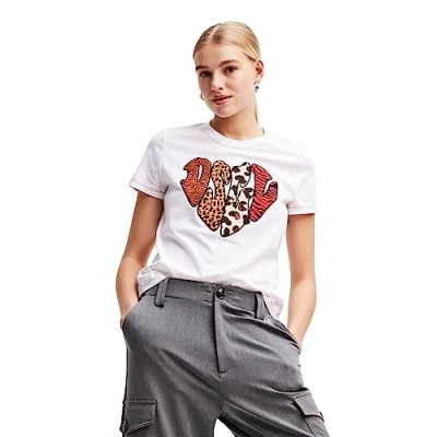 Desigual Regular fit Patch heart with animal print and embroidered outline Crew neck Short sleeves. Contrasting quilted seams