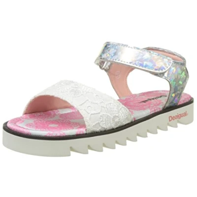 FASHION SANDALS - Girl's Desigual heel sandals in a trendy silver color with an ankle strap design COMFORTABLE FIT - Features an artificial insole and synthetic upper for long-lasting comfort IDEAL FOR WALKING - Recommended for casual walks, perfect for everyday use Flat heel design: flat sandal with a heel height of 2 cm, suitable for young girls High quality material: made of synthetic material, which ensures durability and strength PERFECT FIT - Available in size 5, suitable for children with medium width feet