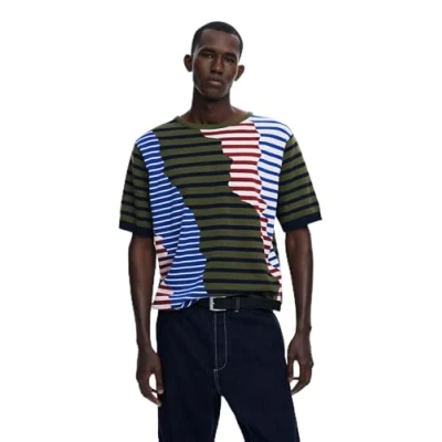 Fit: Regular Color: Multicolor Neckline: Round Sleeve: Short Asymmetric stripe print in different colors