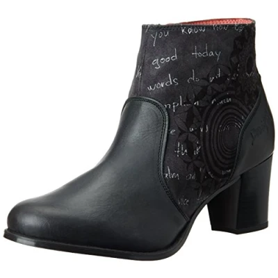 Stylish Ankle Boots: Showcase your fashion sense with these Desigual women's Cris ankle boots, designed with a bohemian style and letter print pattern, perfect for autumn-winter season Comfortable Fit: These black boots are made from synthetic material, offering a comfortable fit with a 6 cm block heel, round toe, and unlined interior Easy Zip Closure: Equipped with a convenient zip closure, allowing for a quick and easy on and off, while maintaining a sleek and stylish appearance Medium Width: These ankle boots are designed for a medium width, providing a snug and secure fit, suitable for various foot shapes Versatile Footwear: Ideal for women who appreciate both comfort and style, these boots are perfect for casual or dressier occasions, and can be easily paired with different outfits