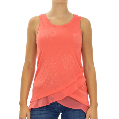 Desigual tank top. Pink colour Wide round neck. Plain design with mandala embroidery. Seams seen in tone. Front cross embroidery. Composition: 90% Polyester, 10% Elastane Washing instructions: - Wash temp. Max 30ºC. -Do not dry in the washing machine. -Do not mix colors -Temperature max. 110ºC Composition: 90% Polyester, 10% Elastane Care: Washing instructions: - Wash temp. Max 30ºC. -Do not dry in the washing machine. -Do not mix colors -Max. temperature 110ºC