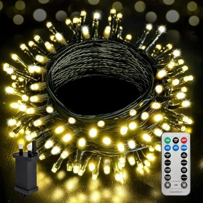 Remote-Controlled Christmas Lighting – Adjust 8 festive modes, 3 timer settings, and 4 brightness levels with ease. The memory function restores your last setting, giving your Christmas décor a consistent warm glow every night. Outdoor-Ready for Winter Décor – IP44 waterproof design ensures reliable performance in rain, snow, and cold weather. Safe 31V low voltage makes these Christmas lights ideal for trees, gardens, rooftops, and outdoor holiday displays. 8 Festive Lighting Modes – Choose from Steady On, In Waves, Sequential, Slo-Glo, Chasing/Flash, Fade, Twinkle/Flash, or Combination to create a magical Christmas atmosphere. Switch modes easily using the remote or power button. Bright and Energy-Efficient LEDs – Built with durable, low-heat LED beads that deliver long-lasting brightness throughout the season. Perfect for indoor and outdoor Christmas decorations that stay glowing night after night. Perfect for Christmas Trees and Homes – The 30m string with 300 warm white LEDs adds a classic festive look to trees, banisters, windows, and gardens. Designed to enhance your holiday décor with a soft, welcoming Christmas shimmer.