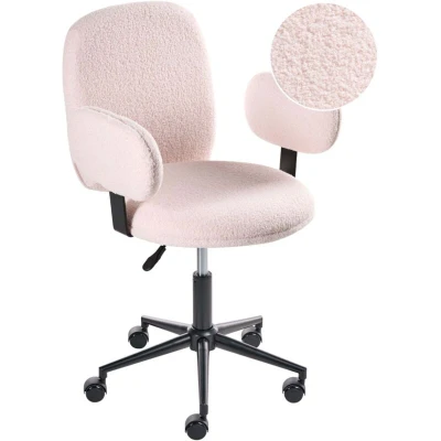 Plush Desk Chair with Armrests. Create a cosy space in your office by adding this comfortable armchair. Its thick seat and backrest, with the addition of armrests, are all upholstered with soft-to-the-touch boucle fabric in a beautiful shade. The classic black base is made of durable metal that ensures stability and thanks to the gas lift you can adjust the chair's height to your needs. It also includes a 360° swivel function, which makes it a great addition to your room. Details: Product Type: Office Chair General Color: Pink, Black Shade: Pastel Pink Material Type: Fabric Main Material: Boucle Additional Material: Iron Legs material: Metal Seat Material: Boucle Material Composition: 100% Polyester 360 Swivel: Yes Adjustable Parts: Seat Height Armrests: Yes Finish: Powder Coated Leg Caps/ Pads: No Tilting: No Dimensions: Armrests Height: 66 cm Depth: 58 cm Seat Height: 42-57 cm Width: 58 cm Height: 80-95 cm Seating Surface: 46x46 cm Weight: 8 kg Weight Capacity: 130 kg Offer