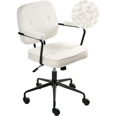 General description Refresh your office space with the PAWNEE Boucle Off-White Swivel Desk Chair, designed in a retro style. This functional chair features a 360° swivel mechanism, a tilting option, and a gas lift for adjustable height, ensuring comfort and versatility. Upholstered in durable boucle fabric, it boasts a button-tufted backrest, padded armrests, and a sleek seating area, making it a perfect fit for both traditional and modern interiors. Technical specifications Product Type: Office Chair Style: Retro General Color: Off-White Main Material: Boucle Additional Material: Iron Legs Material: Metal Seat Material: Faux Leather Material Composition: 100% Polyester Weight: 9.7 kg Weight Capacity: 100 kg Dimensions: Armrests Height: 70-77 cm, Depth: 43 cm, Seat Height: 49-56 cm, Width: 62 cm, Height: 88-95 cm, Seating Surface: 47x43 cm Installation Assembly Time: 20-40 minutes Legs to be fitted Usage Check stability and safety of the chair 2 weeks after assembly Tighten screws