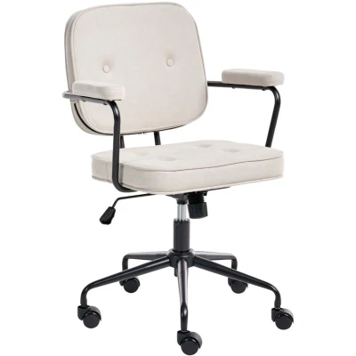 General description Refresh your office space with the PAWNEE Velvet Light Beige Swivel Desk Chair in Retro Style. This functional desk chair features a 360° swivel mechanism, a tilting option, and a gas lift for adjustable height according to your preferences. Upholstered in durable velvet fabric, it boasts a button-tufted backrest, padded armrests, and seating for a simple yet elegant finish. The chromed metal legs and base ensure stability and durability, making it suitable for both traditional and modern interiors. Technical specifications Product Type: Office Chair Style: Retro General Color: Light Beige Main Material: Velvet Legs Material: Metal Seat Material: Faux Leather Material Composition: 100% Polyester Weight: 9.7 kg Weight Capacity: 100 kg Dimensions: Armrests Height: 70-77 cm Depth: 43 cm Seat Height: 49-56 cm Width: 62 cm Height: 88-95 cm Seating Surface: 47x43 cm Installation Assembly Time: 20-40 min Legs to be fitted Usage Check stability and safety of the product 2