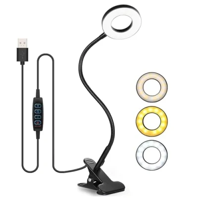 Eye-Caring Soft Light: This led book light utilizes advanced LED technology to emit soft, flicker-free light, protecting your eyes and preventing fatigue from prolonged use. 3 Color Temperature Modes & 10 Brightness Levels: Cool white, natural light, and warm white to meet your different needs. Whether for work, study, or leisure reading, you can find the right light. Stepless Dimming- Easily adjust the brightness through the touch switch, from low to high, as you wish. Flexible Clip Design: Strong clamping base can be easily fixed on desks, bedsides, bookshelves, and more. Equipped with anti-slip pads to ensure stability without damaging furniture surfaces. 360° Rotatable Lamp Head: Flexible arm can rotate 360 degrees freely, allowing you to adjust the lighting angle to precisely where you need it. Portable and Lightweight: This dimmable reading light lightweight design, easy to carry, providing comfortable lighting anytime, anywhere, whether at home, in the office, or on the go. What you'll get - 1x Reading Lamp with Clamp, 1x User Manual