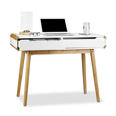 AmazonBright design: Elegant white desk with drawers - Light computer table for the home office - The Nordic design matches in children’s rooms too 2 drawers: Office desk with 2 drawers for writing utensils and stationary - Drawers with cut-out handles - Box dimensions: HxWxD: ca 5.5 x 43 x 33 cm Nordic: Stylish mix of white-lacquered tabletop and rounded edges in wood-tones - Table frame made of bamboo - Emits a peaceful and cosy flair - Ideal for light interiors Robust: The tabletop made of lacquered MDF is easy to clean - The wooden legs made of bamboo are highly durable - Writing surface size: ca 100 x 45 cm Universal: Original side table for any room - Practical vanity for the bedroom or bathroom - Kid’s writing desk for boys and girls