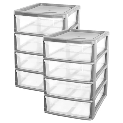 Desktop Modular Table Top Small Bedside A4 Silver Storage Tower Unit For Home Office & Schools With 4 Clear Drawers