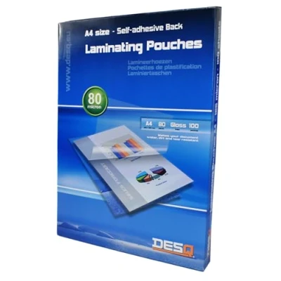 DESQ® Laminating Pouches A4 80 Micron Gloss Self Adhesive Backed with Rounded Corners Pack of 100 216mm x 303mm Premium