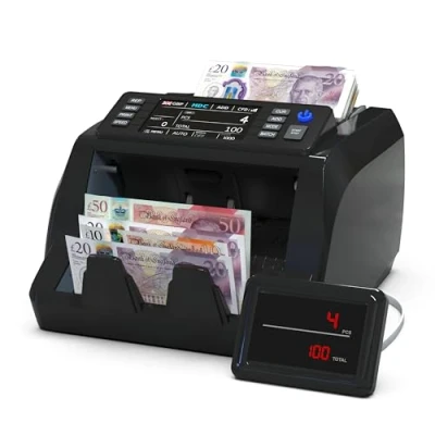 Advanced detection: UV, MG, IR, MT and CIS identify counterfeit, double, chained, half or mis-sized notes. Touchscreen + external display: 4.5” user-friendly interface with included customer-facing display. Multi-currency support: GBP, EUR, CHF, USD, SEK, PLN, TRY and DKK with auto-recognition and mixed counting. Professional features: add, batch, reports, serial number reading, USB upgrades. Optional printer available. High speed & accuracy: up to 1200 notes/minute with 200-note hopper and compact, durable design.