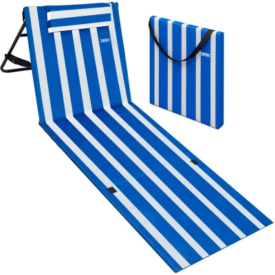 Detex® Folding Beach Lounger With Adjustable Backrest Lightly Padded Foldable Sun Bed Side Pocket Cushion Shoulder Strap Weatherproof Mat Blue And White
