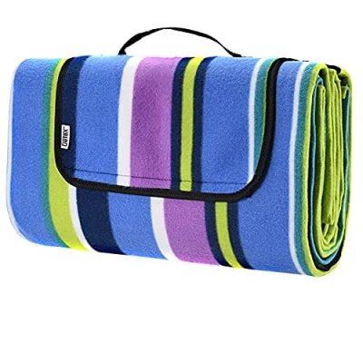 Detex® XL Waterproof Fleece Picnic Blanket 200x200cm Camping Heat Insulated Hand Washable Foldable For 4 6 People Garden Beach Blue Purple Striped