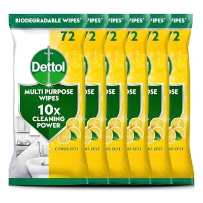 Dettol Antibacterial Multipurpose Cleaning Wipes, Citrus Zest, 70 pack (6 x 72, Total 432 Wipes) Disinfectant, Biodegradable, 10x power vs Water alone, Kills 99.9 Percent of Germs