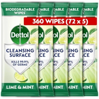 Dettol Antibacterial Surface Cleaning Disinfectant Wipes, Lime And Mint, Multipack Of 5 X 72, Total 360 Wipes