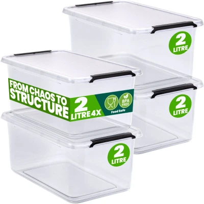 Deuba® 4x 2 Litre Storage Boxes With Click Closure Secure Lid BPA Free Food Safe Plastic Box Small Stackable Transparent Organiser for Kitchen Bedroom Garage Office