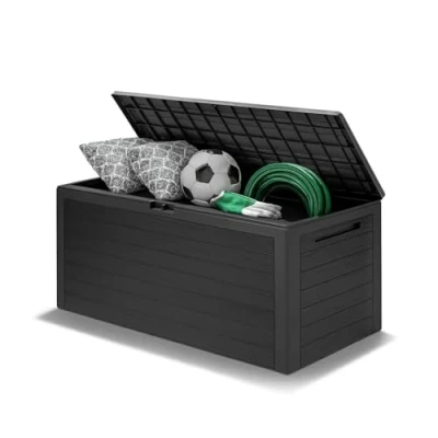 ManoManoGeneral description Lots of storage space in a modern wooden design! The sturdy garden box in a trendy wooden design with a capacity of 280 litres offers enough space for your seat covers, cushions, garden accessories, and much more. The plastic storage box features a hinged lid with an integrated locking device, ensuring your items are secure. Thanks to the practical recessed grips, the chest can be easily positioned and moved, making it a versatile addition to your outdoor space. Technical specifications Dimensions: 119 x 46 x 57 cm (LxWxH), inside dimensions: 116 x 43 x 54 cm Capacity: 280 litres Material: Plastic Colour: Anthracite-brown Installation Easy assembly with a practical click system No additional tools required for setup Usage Ideal for storing seat pads, pillows, and other garden accessories Suitable for terrace, balcony, and garden Other information Locking device for padlock (not included) Decoration material is not included Caution: The box is not suitable for