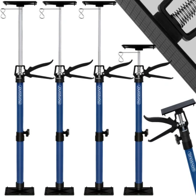 General description This set of 4 door frame tensioners is designed for reliable and sturdy support during drywall and plasterboard installation. They can reach from the ground to the ceiling and are ideal for assembling doors. With a maximum load capacity of 30 kg, these props are perfect for both workshop use and home renovation projects. The non-slip, rubberized pressure plates ensure a stable grip, making them a go-to tool for tradesmen, especially when working indoors. Technical specifications Material rods: steel Material pressure plate + lever: polypropylene / polyvinyl chloride Dimensions: 115-290 cm (45.27 x 114.17 in) Max. load capacity: 30 kg Colour: blue Other information Includes 4 door clamps / frame clamps Pressure plate adjustable up to 45 degrees Infinitely height adjustable Metal eyelet for securing against unintentional falling over or for quickly retrieving the pressure plate