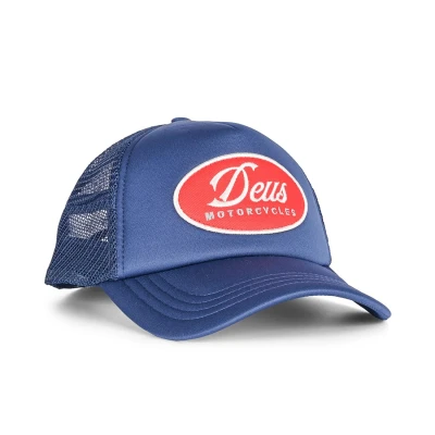 * The Deus Ex Machina Ride Out mesh back adjustable trucker cap is a classic trucker hat made from polyester fabric and features a snap closure on the back and Deus branded logo embroidered patch detail on the front and back * Curved brim * Embroidered Patch label details * Adjustable fastener * 100% Polyester
