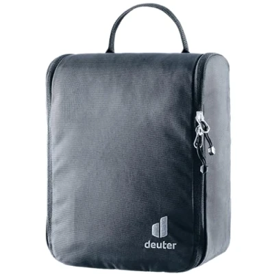 Two flat zip pockets (1x mesh) Stowable hook for hanging Large main compartment with mesh pockets Extra removable mesh pocket with hook for hanging Removable mirror