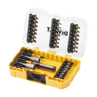 IMPACT READY FLEXTORQ BITS: Designed to withstand high torque demands, these bits are resistant to wear and shock for reliable performance. PRECISION MACHINED TIP GEOMETRY: Ensures full fitment in fasteners, reduces cam-out, and minimises screw head rounding for professional results. LASER ETCHED SIZE IDENTIFICATION: Clearly marked bit type and size provide rapid, accurate selection for easy identification on the job. TORSION ZONE TECHNOLOGY: Specially contoured area flexes with the torque of the impact driver, absorbing peaks and extending bit life. QUICK & EASY BIT REMOVAL/RETENTION: Bits lock securely in place to prevent loss and offer swift access when needed, enhancing user convenience. MODULAR DESIGN: Connectable case enables multiple sets to be stacked and locked together, compatible with small, medium, and large Tough Cases, and fits inside the TSTAK Caddy. TSTAK COMPATIBLE TOUGHCASE: Versatile, customisable, and connectable accessory set system; cases lock together for secure transport and storage. Seamlessly integrates with the TSTAK Caddy and large Tough Case, keeping all accessory sets organised in one place. CLEAR LID FOR EASY SELECTION: Transparent lid allows for quick and effortless identification of the required bit, saving valuable time on the job. CUSTOMISABLE INNER DOVETAIL SYSTEM: Move and arrange bit bars and accessories to suit individual preferences, ensuring a bespoke tool set-up. INCLUDES: This 33 pc kit contains broad selection of screwdriver bits, including Phillips bits in sizes PH1, PH2, and PH3; Pozidriv bits in sizes PZ1, PZ2, and PZ3 and Torx bits ranging from T10 to T30, with extra T20 and T25 bits for versatility. Additionally, it features 8mm and 10mm nut drivers, and comes with a compact magnetic drive guide equipped with a torsion zone for enhanced durability and bit control., Weight: 0.0010361726314 pounds, Manufacturer: Dewalt