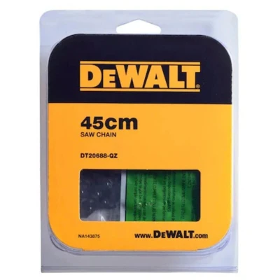 General description This is a high-quality chainsaw chain designed for use with DEWALT FlexVolt chainsaws. Made from high-quality materials, it features a durable construction to ensure efficient cutting performance and long-lasting use. The chain is suitable for various cutting tasks, providing reliable and precise results. Technical specifications Bar Length: 45 cm Material: High-quality steel for durability and sharpness Compatibility and accessories Compatible with DEWALT FlexVolt chainsaw models that use a 45 cm bar Includes only the chainsaw chain; other accessories are sold separately Installation Ensure the chainsaw is turned off and unplugged before installation Remove the old chain if present Align the new chain properly on the guide bar Follow the manufacturer's instructions for tensioning and securing the chain Usage Use appropriate safety gear when operating the chainsaw Ensure the chain is properly tensioned before use Cut with controlled, steady movements for best