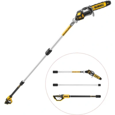 General description The DeWalt DCMPS567N is an 18V XR cordless pole saw designed for efficient overhead cutting and tree maintenance. With a reach of up to 4.5 meters, this tool is perfect for pruning and trimming hard-to-reach branches without the need for a ladder. It features a lightweight aluminum pole and a compact, balanced design for enhanced control during use. Technical specifications Bar length: 200 mm (20 cm) Chain speed: ~6.5 m/s Pole length (base): 2 m; extended reach up to ~4.5 m Weight (bare tool): ~3.8 kg Oil tank capacity: ~115 mL Motor type: Brushless Chain gauge: 1 mm Chain pitch: 3/8" No. of drive links: 34 Vibration level: 2.5 m/s² Usage Ideal for pruning, trimming, and maintenance tasks at height. Always wear appropriate protective gear when operating overhead. Ensure the chain is properly tensioned and lubricated before use. Utilize the dual-switch mechanism for safe operation and avoid overreaching. On a 5 Ah XR battery, it can perform approximately 50 cuts on