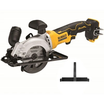 General description The DEWALT DCS571 XR Brushless Compact Circular Saw is designed for extended run time, reliability, and durability. It features a cast gearbox for repetitive, accurate cuts and an intelligent trigger for total control over all applications. The saw is equipped with an ergonomic handle set with rubber overmould for optimal user comfort and includes a spindle lock for quick and easy blade changes. This bare unit does not include a battery or charger. Technical specifications No Load Speed: 4,500/min Blade Diameter: 115mm Bore Diameter: 9.5mm Bevel Capacity: 0-45° Max. Depth of Cut at 90°: 38mm Weight: 2.5kg Voltage: 18V Usage The DEWALT DCS571 is ideal for various applications including trimming roof battens, fitting sheet flooring, and sizing stud timber and OSB/plywood panels. The brushless motor provides optimum efficiency, allowing for up to 94 linear metres of 12mm plywood to be cut per 5.0Ah battery charge. The tool-free depth lever and bevel lever enable quick