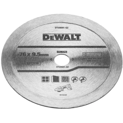General description The DEWALT DT20591 Diamond Tile Blade 76mm is designed for both dry and wet cutting of various types of tiles and ceramics. Its fine diamond grit ensures a precise, chip-free finish, making it ideal for professional and DIY projects. Technical specifications Diameter: 76 mm Blade thickness: 1.6 mm Arbor size: 9.5 mm Max RPM: 20,300 Diamond coating: Yes Compatibility and accessories Compatible with angle grinders and tile cutters that accept a 76 mm blade Suitable for cutting ceramic tiles, marble tiles, and porcelain tiles Installation Ensure the power tool is unplugged before installation Attach the blade securely to the arbor, ensuring it is properly aligned Use appropriate safety gear during installation and operation Usage Use the blade for dry or wet cutting of tiles and similar materials Apply steady pressure during cutting for best results Follow safety guidelines to prevent accidents and damage Other information