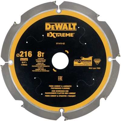 General description The DEWALT Extreme PCD Fibre Cement Saw Blade is designed for superior cutting performance in fibre cement and other materials. Featuring synthetic PCD (Polycrystalline Diamond) tipped teeth, this blade offers 100% longer life compared to traditional TCT tipped blades. Its laser-cut design includes anti-vibration body slots and precision ground tips, which help to minimize dust production during cutting. Technical specifications Blade Diameter: 216mm Bore Size: 30mm Tooth Count: 8 Kerf Thickness: 2.0mm Plate Thickness: 1.5mm Grind: FTOP Rake Angle: 12° Compatibility and accessories Suitable for cutting fibre cement board Compatible with laminate/pre-finished flooring Can cut MDF and plywood Other information MPN: DT1473-QZ EAN: 5035048540947