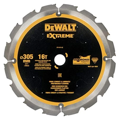 General description The DEWALT Extreme PCD Fibre Cement Saw Blade is designed for superior performance and longevity when cutting fibre cement and other materials. Featuring synthetic PCD (Polycrystalline Diamond) tipped teeth, this blade offers 100% longer life compared to traditional TCT tipped blades. Its innovative design includes anti-vibration body slots and precision ground tips, which help reduce dust production during cutting. Technical specifications Blade Diameter: 305mm Bore Size: 30mm Tooth Count: 16 Kerf Thickness: 2.4mm Plate Thickness: 1.8mm Grind: FTOP Rake Angle: 12° Compatibility and accessories Suitable for cutting fibre cement board Compatible with laminate/pre-finished flooring Can cut MDF and plywood Other information MPN: DT1475-QZ EAN: 5035048540961