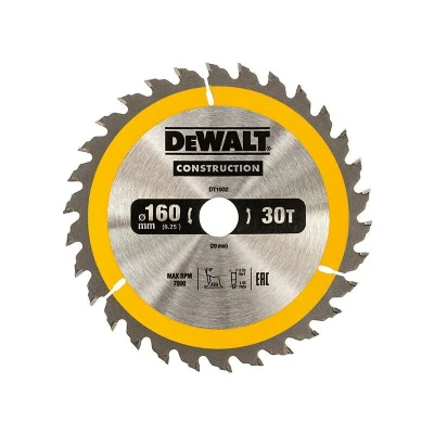 General description DEWALT Construction Circular Saw Blade designed for use with portable machines, ideal for cutting softwoods, composites, and materials with embedded nails. The blade features impact-resistant carbide teeth that minimize chipping and breaking, along with ultra-sharp cutting edges and Alternate Top Bevel (ATB) teeth to reduce splinters. Its durable construction ensures fast, smooth cutting, making it suitable for demanding job site operations, rough timber, and cutting through embedded nails. Technical specifications Blade Diameter: 160 mm Blade Bore: 20 mm Tooth Count: 30 Plate Thickness: 1.5 mm Kerf Thickness: 2.5 mm Grind Type: ATB Rake Angle: +10° Tooth Pitch: 2.4 mm Tooth Direction: Counterclockwise Application Material: Multi-purpose Performance Level: Standard Packaging Unit: 1 Compatibility and accessories Compatible with most circular saws that have a 160 mm diameter and 20 mm bore. Installation Install the blade onto compatible circular saws with a 20 mm