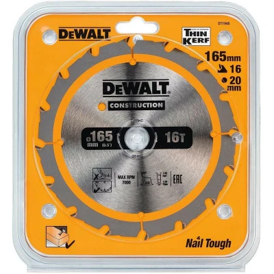 General description The DEWALT Cordless Construction Trim Saw Blade is engineered for fast and efficient cutting in wood. With impact-resistant carbide teeth, it minimizes the risk of chipping or breaking, ensuring durability and longevity. The ultra-sharp teeth require less force for cutting, making it easier to work with timber. Its thin kerf design allows for more cuts per charge, reducing battery drain, while the triple action sharpening process provides a razor-sharp edge for a smooth finish. This blade is ideal for demanding jobsite operations. Technical specifications Blade Diameter: 165mm Blade Bore: 20mm Tooth Count: 16 Plate Thickness: 1.0mm Kerf Thickness: 1.65mm Grind Type: ATB Rake Angle: +24° Compatibility and accessories Compatible with DW935 and DW936 models