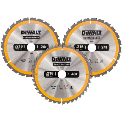 General description The DEWALT DT1962QZ 216MM TCT Blade pack is designed for extreme runtime and optimized for Flexvolt technology. These blades are perfect for cutting through nail-embedded wood, providing increased efficiency and maximum cordless runtime. They offer 2X life compared to standard construction blades, ensuring additional runtime and cuts per charge when used with Flexvolt batteries and tools. The ultra-thin kerf design allows for smooth cuts with low cutting force. Technical specifications Blade Size: 216 x 30mm Tooth Count: 24T (2 blades), 40T (1 blade) Plate Thickness: 1.7mm Kerf Thickness: 2.5mm Grind Type: ATB Rake Angle: -5° Other information Wedge shoulder design protects carbide from nail impact Ideal for demanding on-site operations