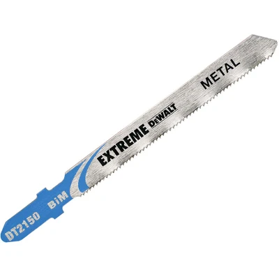 General description The DEWALT DT2150 EXTREME T Shank Metal Cutting Blades are designed for fast and precise cuts in various metals, including steel, aluminum, copper, and brass, up to 3mm thick. These bi-metal saw blades deliver superior surface finish and precision, ensuring a long cutting life. The reinforced tooth design enhances durability, reducing blade breakage and wandering, while the bi-metal construction provides flexibility and strength. Technical specifications Total length: 86 mm Cutting length: 61 mm Tooth pitch: 1 mm Maximum cutting depth: 3 mm MPN: DT2150-QZ EAN: 5035048059425 Compatibility and accessories Compatible with jigsaws and reciprocating saws that accept standard bi-metal blades Suitable for use with heavy-duty demolition hammers with 28mm hex shank for chisel applications Installation Insert the blade into the compatible tool's chuck or holder, ensuring it is securely fixed Follow the manufacturer's instructions for proper installation and safety