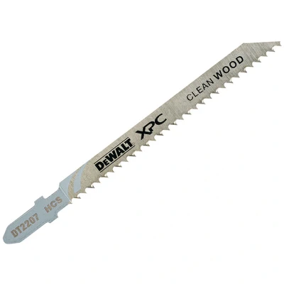 General description The DEWALT DT2207-QZ (T101BR) XPC HCS Wood Jigsaw Blades are designed for clean, splinter-free cuts in various wood materials, including hard and soft woods, chipboard, plywood, and laminates. With advanced features such as a thicker blade body and optimized tooth geometry, these blades ensure exceptional durability and performance, making them ideal for detailed woodworking projects. Technical specifications Material: HCS Type: T101BR Total length: 100 mm Cutting length: 70 mm Tooth pitch: 2.5 mm Maximum cutting depth: 40 mm Quantity per pack: 5 blades Compatibility and accessories Compatible with most standard jigsaws that accept blades of 100 mm total length Equivalent to Bosch T101BR blades Installation Insert the blade into the jigsaw's blade holder, ensuring it is securely locked in place Check that the blade is properly aligned before starting to cut Usage Use for precise, clean cuts in woodworking, laminates, and melamine up to 40 mm thick Apply steady
