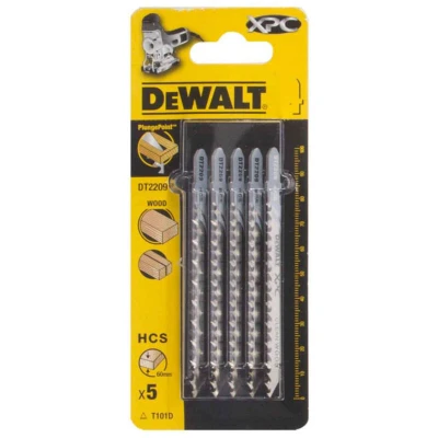 General description The DeWALT DT2209-QZ T101D jigsaw blades are engineered for fast, clean cuts in softwood, plywood, chipboard, and plastic up to 60mm thick. Made from high carbon steel (HCS), these blades feature precision-ground teeth that ensure a splinter-free finish and long-lasting performance, making them ideal for general woodworking and DIY tasks. Technical specifications Blade length: 100 mm Cutting depth: up to 60 mm Tooth pitch: 4.2 mm (10 TPI) Material: High Carbon Steel (HCS) Shank type: T-shank Pack quantity: 5 blades Compatibility and accessories Compatible with most jigsaws that accept T-shank blades Includes 5 identical blades for high-volume work or replacements Installation Insert the blade into the jigsaw's blade clamp, ensuring it is securely fastened Make sure the blade is properly aligned before starting cutting Usage Use for cutting wood, plywood, chipboard, laminated panels, and plastic up to 60mm thick Apply steady pressure and let the blade do the work