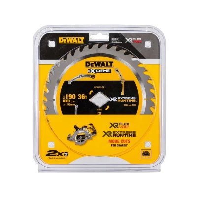 General description This high-quality Dewalt DT40271 Extreme Runtime High Torque Circular Saw Blade is designed for precise and efficient cutting of plywood, softwood, and hardwood. It features a thin kerf for reduced push force, making it ideal for cordless tools. The blade is equipped with expansion slots to minimize noise and vibration, ensuring smoother operation. Its patented grind angles enable faster cuts with less effort, while the diamond bore allows for higher torque drive. This blade is suitable for various materials, providing enhanced performance and durability. Technical specifications Diameter: 190 mm Plate Thickness: 0.82 mm Kerf Thickness: 1.55 mm Number of Teeth: 36 Cutting Material: Carbide C3, allowing up to 3 regrinds Compatibility and accessories Compatible with cordless and corded power tools requiring a 190 mm blade Diamond bore for higher torque drive Installation Ensure the saw is unplugged before installation Align the blade with the arbor and secure it
