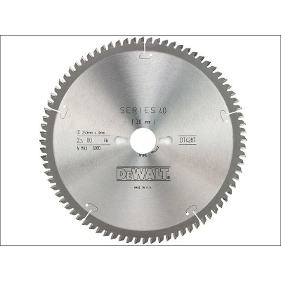 General description The DEWALT Series 40 Circular Saw Blade is engineered for precision cutting, providing an extra fine finish. It is designed for use in stationary saws and is suitable for cutting plywood, veneers, softwood, hardwood, and aluminum. The blade features a triple chip grind geometry that ensures an excellent surface finish on the workpiece. Technical specifications Blade Diameter: 250 mm Blade Bore: 30 mm Tooth Count: 80 Plate Thickness: 3.0 mm Kerf Thickness: 2.2 mm Grind Type: TCGN Rake Angle: -5° Usage Ideal for extra fine cuts in various materials including plywood, veneers, softwood, hardwood, and aluminum. Can be resharpened up to 15 times for extended use. Other information