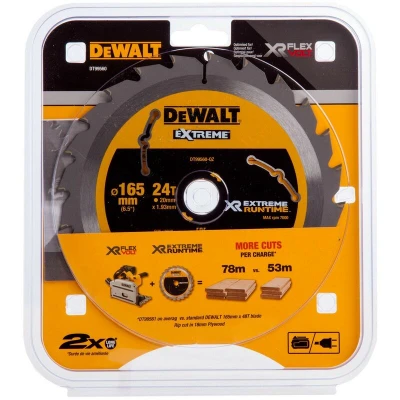 General description The DEWALT DT99560 Xtreme Runtime FlexVolt Circular Saw Blade is engineered for high performance, delivering fast and accurate cuts in heavy-duty applications. It is perfectly suited for cutting large and thick timbers as well as various other site materials. The extreme runtime design provides the blade with twice the working lifespan compared to its market competitors. Technical specifications Diameter: 165 mm Arbor size: 20 mm Teeth count: 24T Compatibility and accessories Compatible with Dewalt Flexvolt DCS520T2 / DCS520NT Plunge Saw Works with XR FlexVolt range and all compatible corded and cordless circular saws, mitre saws, and table saws Usage Optimized for cordless use with up to 2x more cuts per charge Engineered to maximize runtime Designed for smooth and efficient cuts