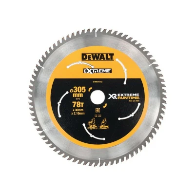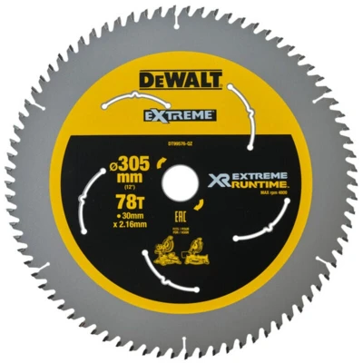 General description The DEWALT DT99576 FlexVolt Extreme Mitre Saw Blade is engineered for high performance, delivering fast and accurate cuts in heavy-duty applications. It is perfectly suited for cutting large and thick timbers as well as various other site materials. The extreme runtime design provides the blade with twice the lifespan compared to standard blades, making it an ideal choice for professionals. Technical specifications Blade Diameter: 305mm Bore Size: 30mm Number of Teeth: 78 Kerf Thickness: 2.16mm Plate Thickness: 1.60mm Grind: ATB+R Rake Angle: 7° Usage Ideal for ripping tasks and cutting through nail embedded wood Designed for use with DEWALT FlexVolt Mitre Saws Optimized for maximum cordless runtime and efficiency Other information MPN: DT99576-QZ EAN: 5035048542385