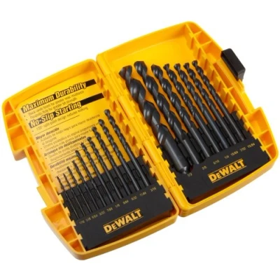 17 black oxide drill bits ranging from 1/16 inch to 1/2 inch 135-degree split-point tip reduces walking when starting bit Unique bit retention system keeps bits in place and makes different sizes easy to identify Set comes in Tough Case container Sliding rubber lock keeps case closed during transport and storage, Weight: 0.5 Pounds, Manufacturer: DEWALT